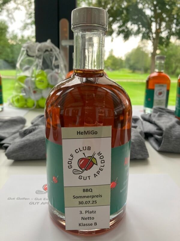 Wir freuen uns sehr, dass wir unseren BBQ-Sommerpreis in diesem Jahr wieder mit der großzügigen Unterstützung von Gut Apeldör spielen konnten. Dabei wurden der Apeldörer Spezialitätenlikör, Logo-Poloshirts, Logo-Caps und Greenfeegutscheine für die Sieger zur Verfügung gestellt. Ein besonderes Highlight waren die Wochenendgutscheine für Übernachtung mit Greenfee für die Erstplatzierten aller Nettoklassen. Aber auch jeder Mitspieler konnte sich mit einem ‚kleinen Spielführer‘ als Starthilfe auf die Runde begeben und erhielt auch noch einen Logoball.