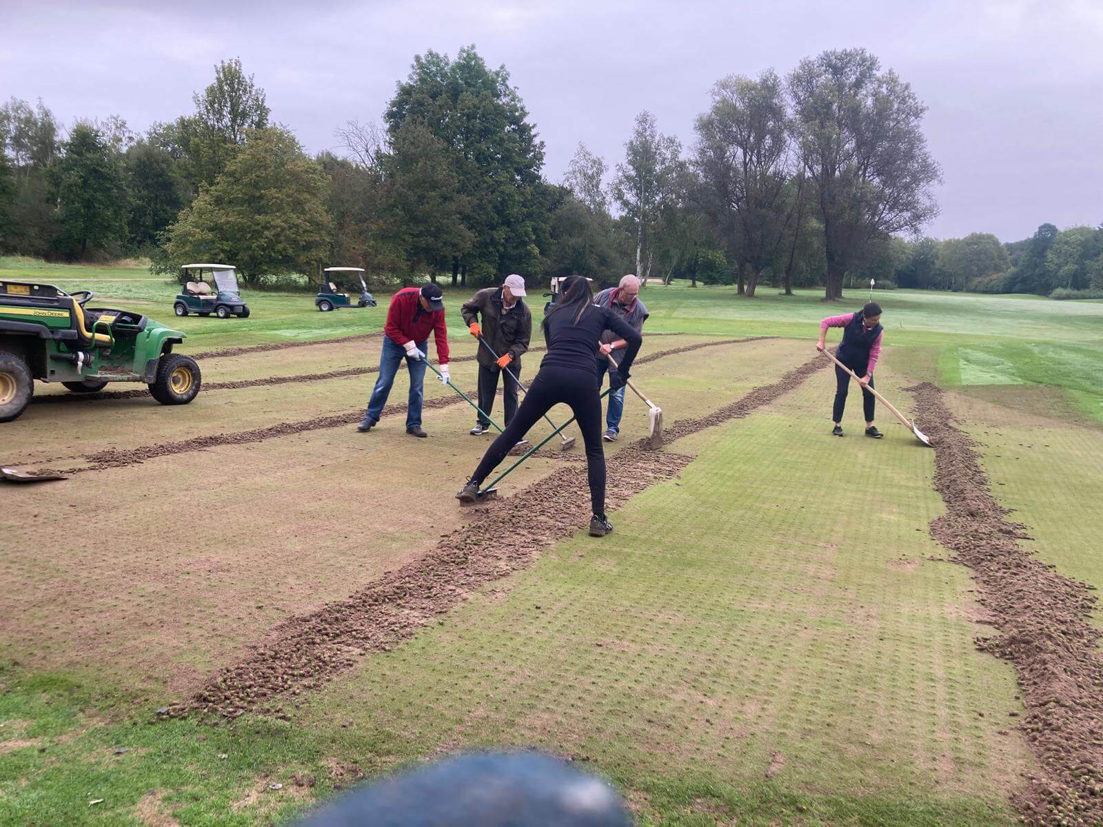 In der Woche ab 15. September wurden, wie jedes Jahr erforderlich, die Grüns des Clubs aerifiziert und gesandet. Diese Arbeiten binden immer das gesamte Greenkeeperteam und erfordern viel Zeit. Deshalb wurden die Clubmitglieder um Mithilfe gebeten. Es meldeten sich 12 Mitglieder und auch ein Nichtmitglied, die Mutter eines Golfschülers half tatkräftig mit.